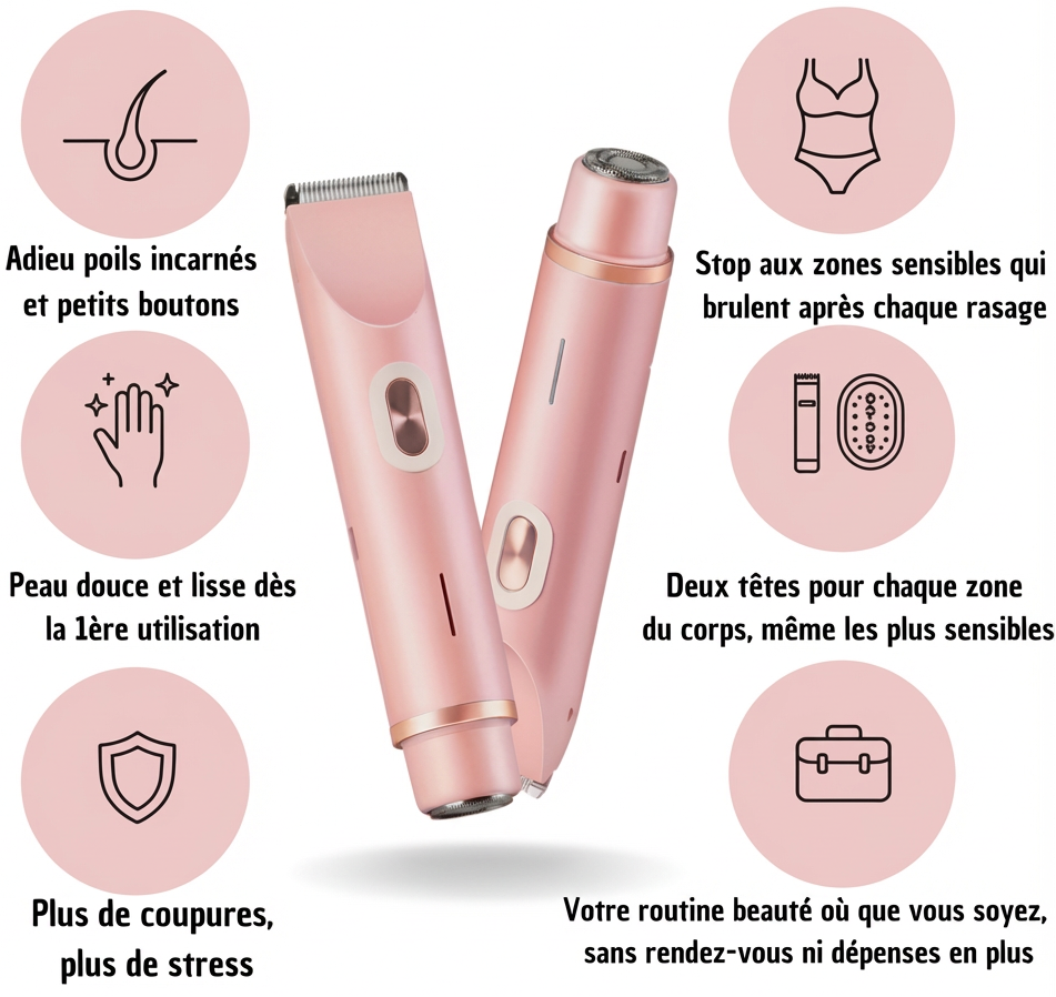 Fatiguée des irritations, des repousses inesthétiques et des coupures ? Découvrez la solution ultime pour une peau parfaitement lisse, sans compromis sur votre confort. Notre rasoir 2-en-1 est conçu pour transformer votre routine beauté.